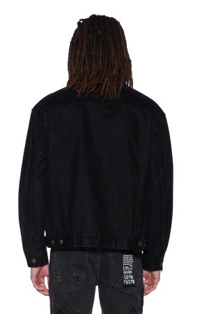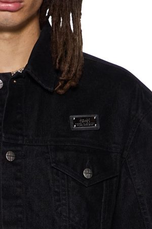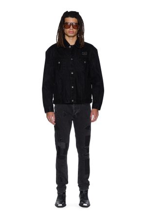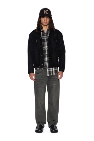 The Oh G Jacket Flocked Black is an oversized fit trucker jacket made from flocked denim and treated with laser and stone washing for an elevated textured finish. Designed with traditional denim trucker construction and paneling. finished with T-box and 4×4 embroidered branding and Ksubi branded hardware.