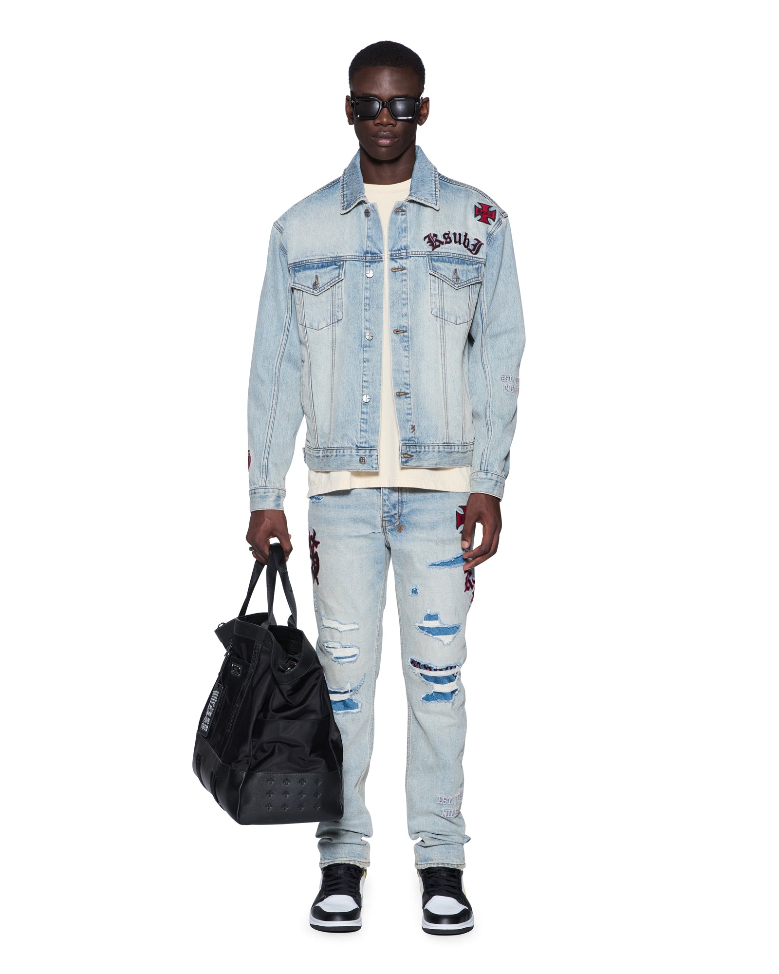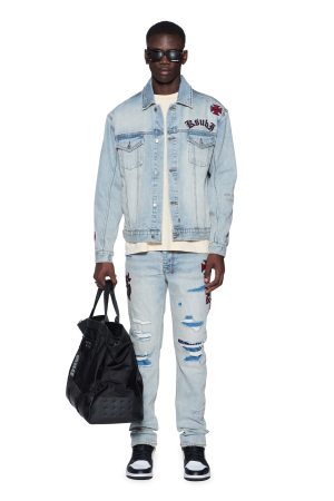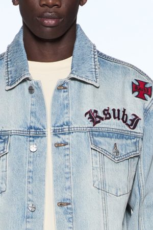 The Oh G Jacket Seattle Blue is an oversized fit trucker jacket made from premium rigid indigo denim with a light-tone wash and authentic aging treatments. It features traditional denim trucker construction and a removable faux fur collar. embellished with seasonal and core Ksubi badging sporadically placed on the jacket. Finished with t-box and 4×4 embroidery branding and Ksubi branded hardware.