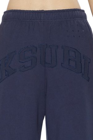 The Origin Trakpant Spliced Ink is a wide leg track pant with elasticated waistband and drawcord designed to sit on mid-waist. It features a side panel with snap button closure piping and welt pockets in the side panel with a ‘Ksubi’ ghost patch and embroidered outline on the back seat. Made from mid-weight cotton fleece in ‘Ink Blue’ and white colourway. it includes front T-box print. Ksubi 3×4. and T-box embroidery. Style back with the 99 Boyfriend Polo Sweatshirt Vintage White.