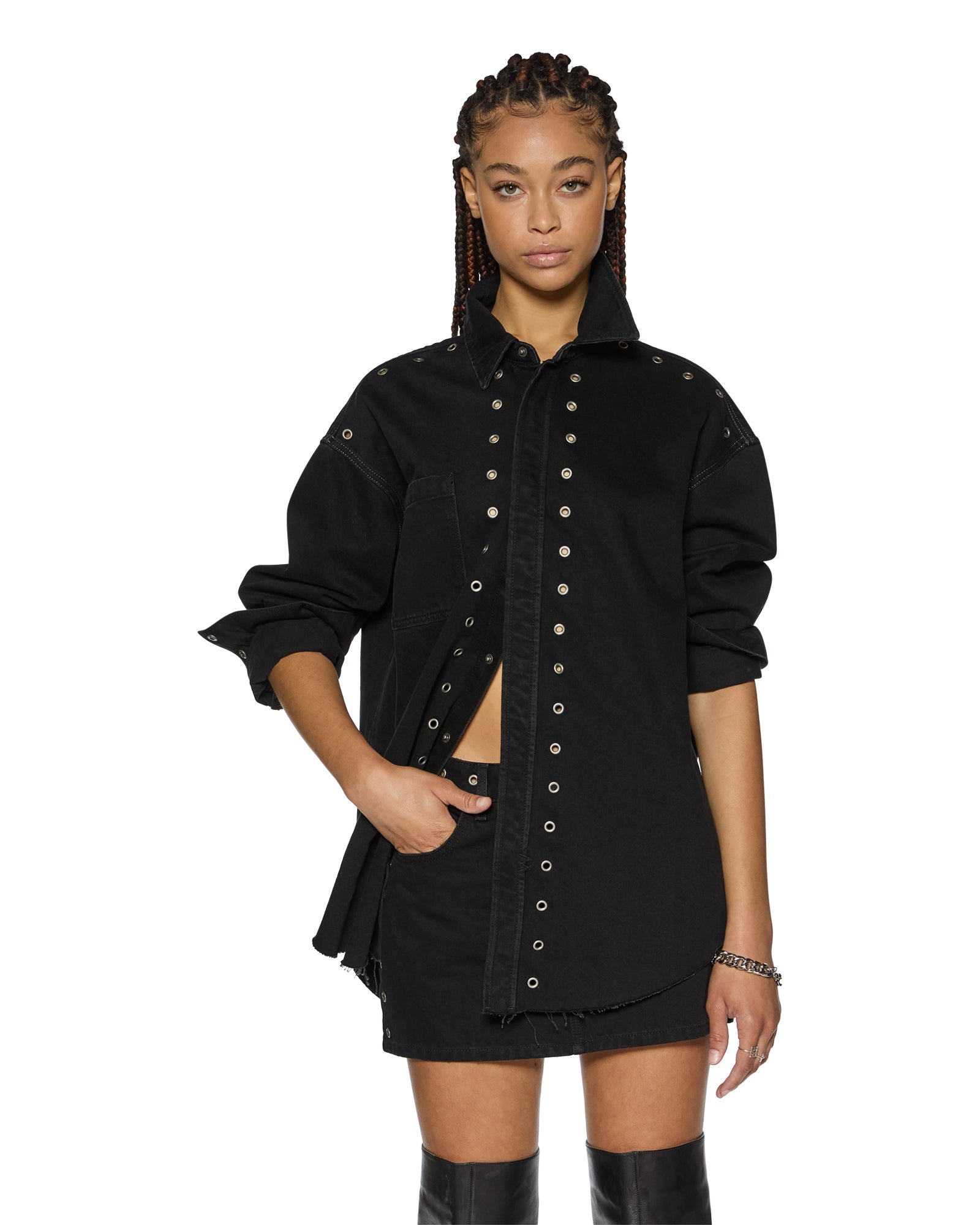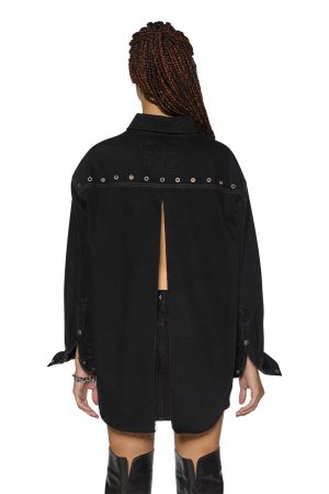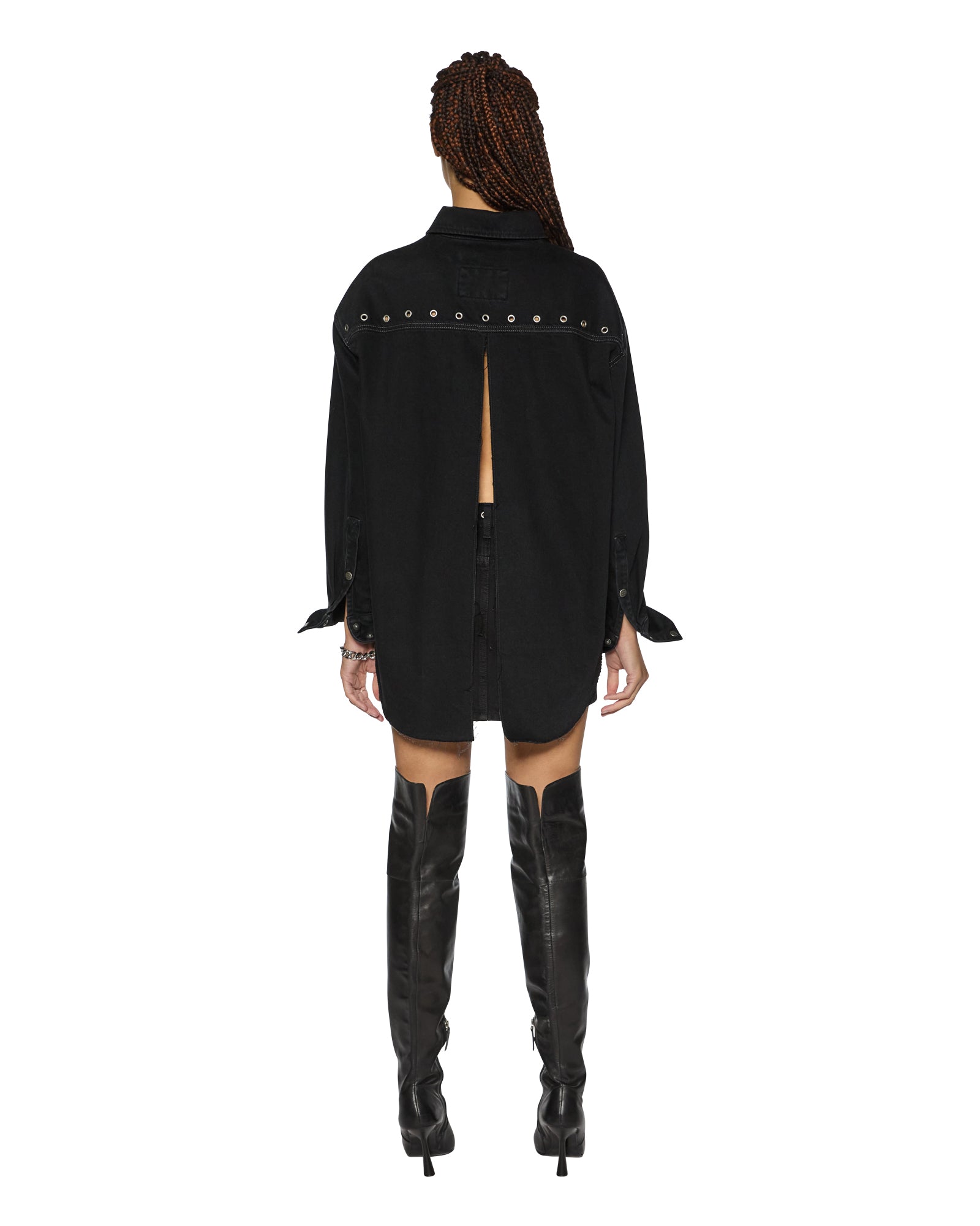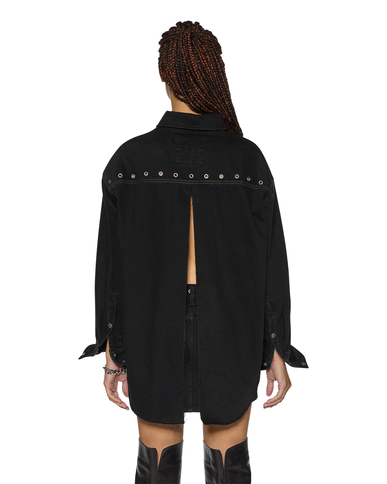 The Oversized Long Sleeve Shirt Split Vice is an oversized fit button-through shirt with full-length sleeves. front patch pockets. and a curved hem. Made from premium European rigid denim in lightly washed black. it features silver eyelet detailing around the shoulders and center front placket. a raw-cut split at the center back. front cross-dollar embroidery. T-box branding. and Ksubi branded hardware. making it the perfect match for the Low Rider Short Vice.