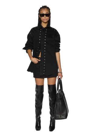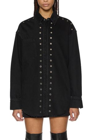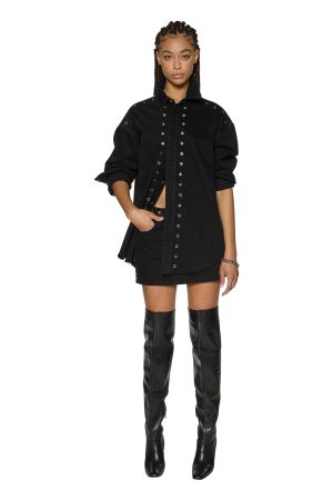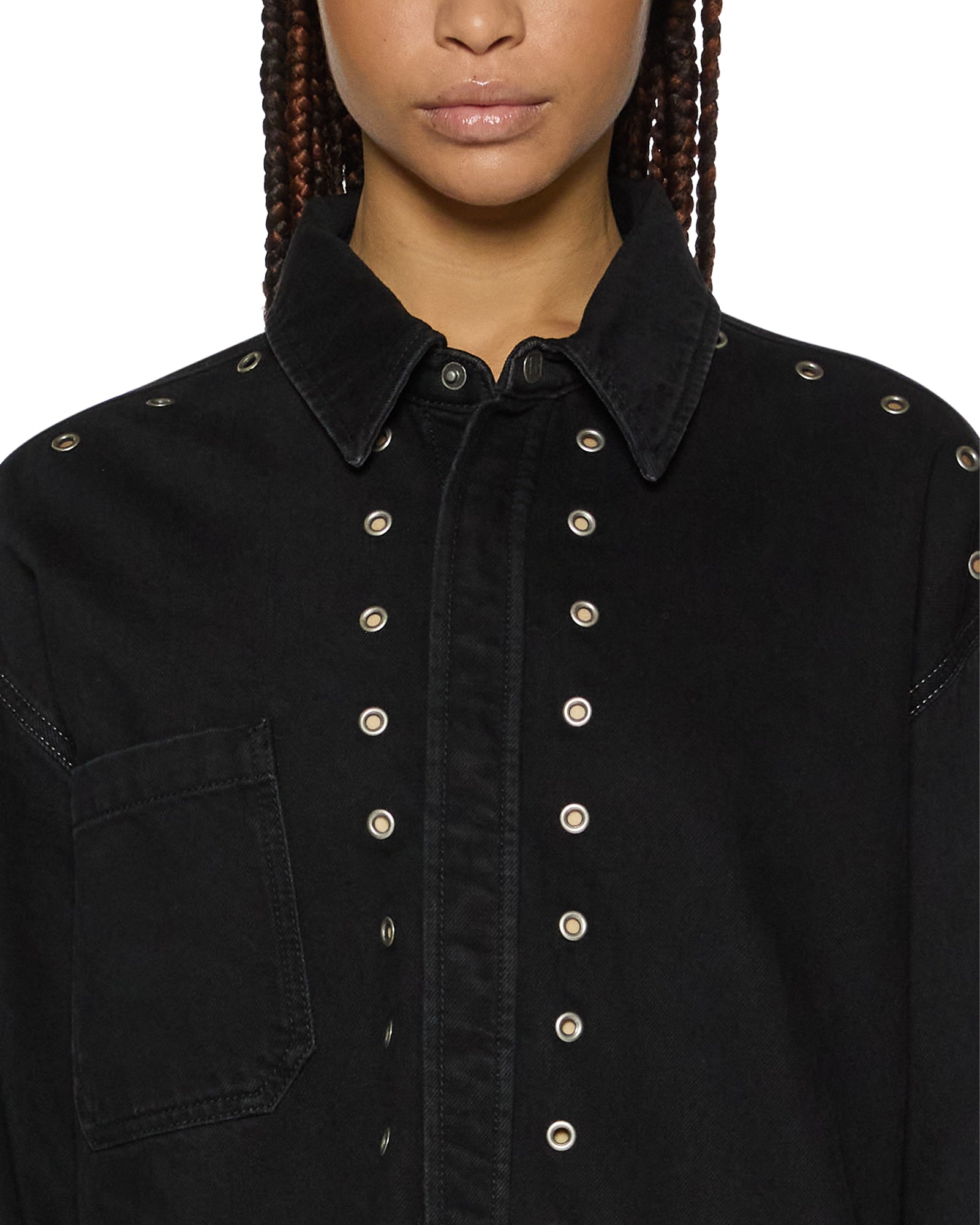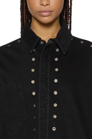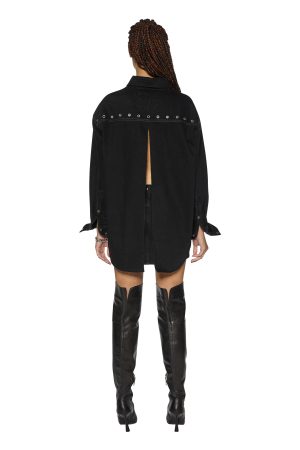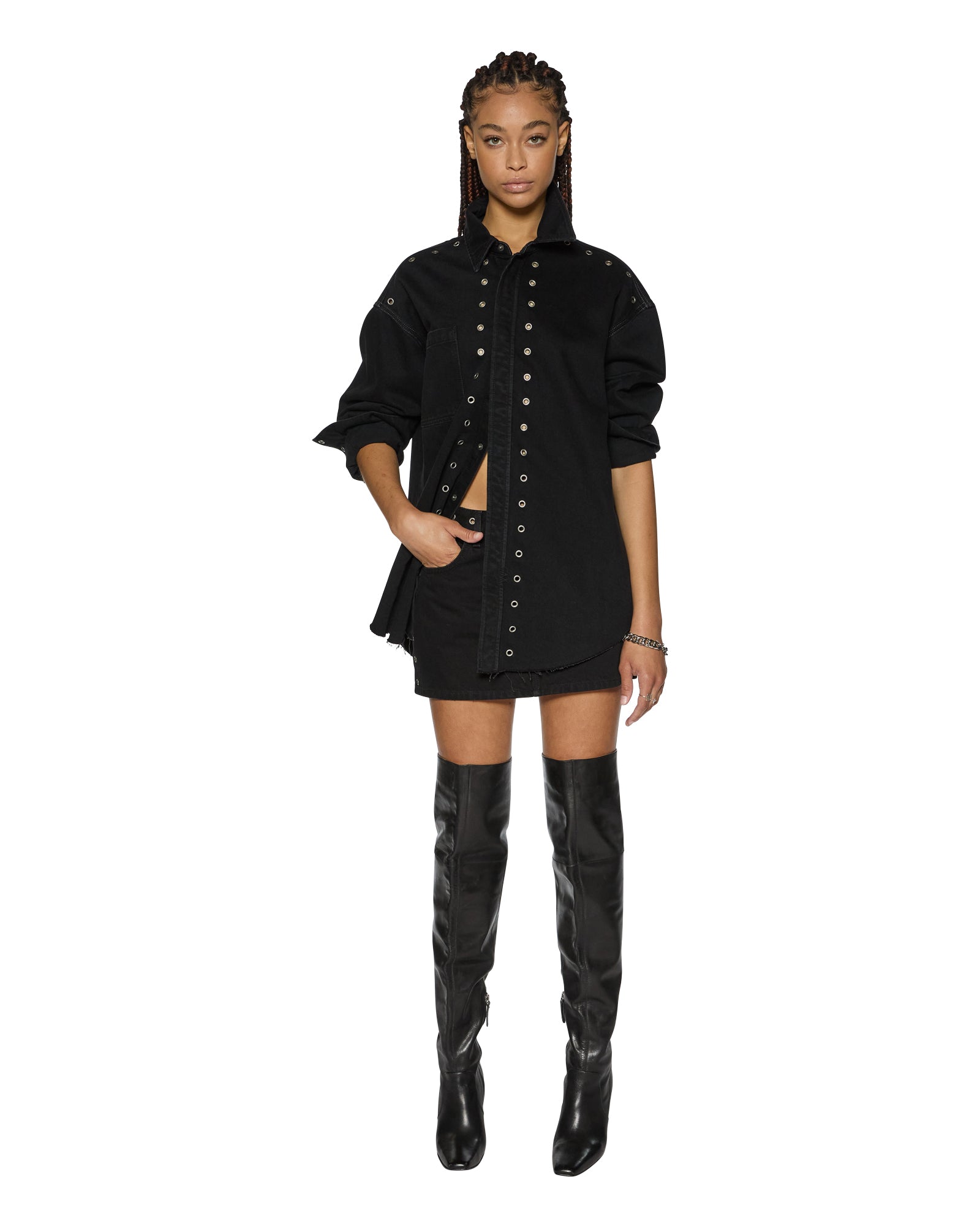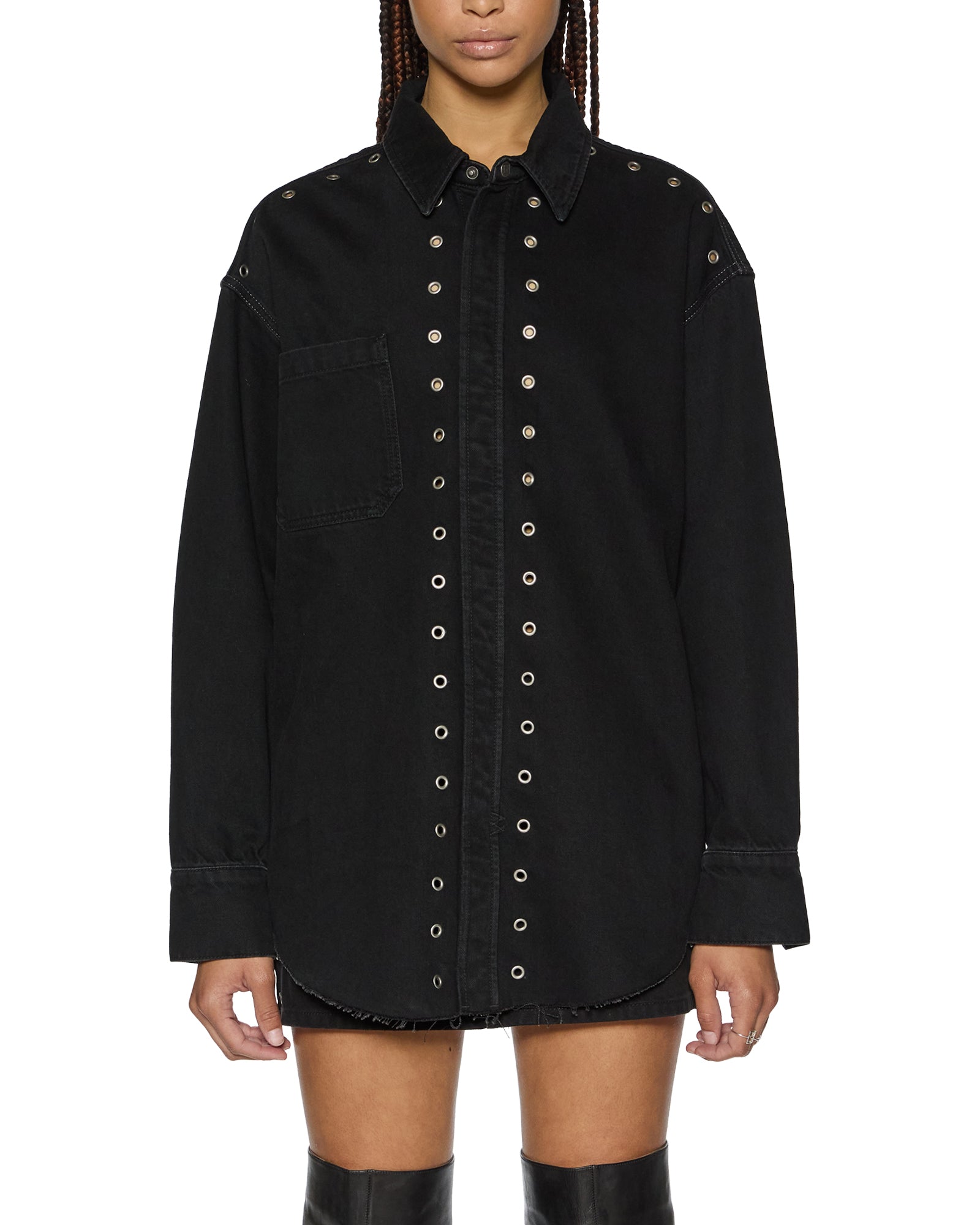 The Oversized Long Sleeve Shirt Split Vice is an oversized fit button-through shirt with full-length sleeves. front patch pockets. and a curved hem. Made from premium European rigid denim in lightly washed black. it features silver eyelet detailing around the shoulders and center front placket. a raw-cut split at the center back. front cross-dollar embroidery. T-box branding. and Ksubi branded hardware. making it the perfect match for the Low Rider Short Vice.