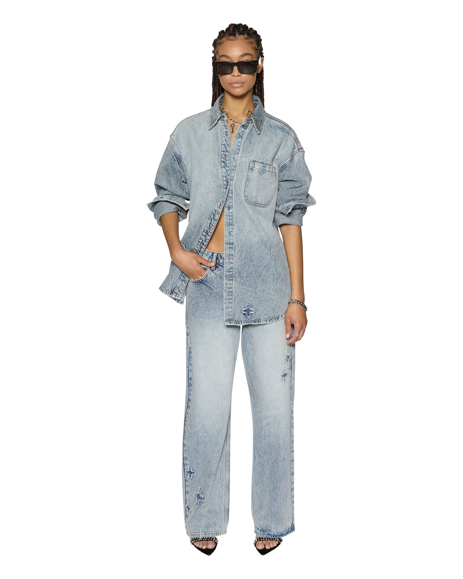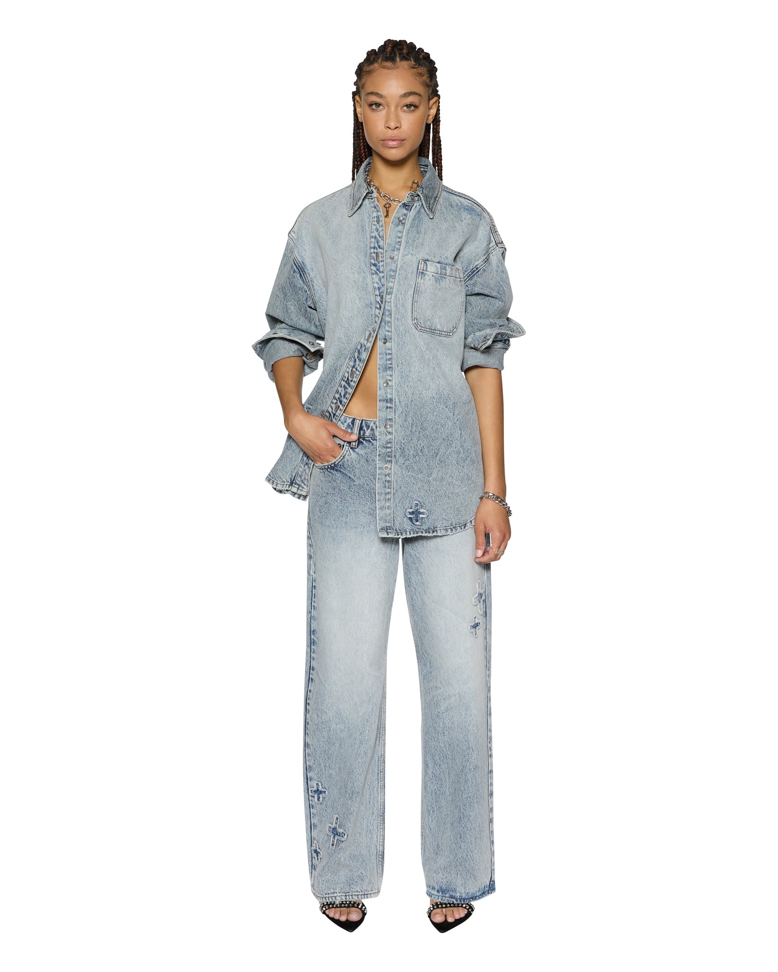 The Oversized Shirt Klassic Kraftwerk is an oversized fit button-through shirt with full-length sleeves. front patch pockets. and a curved hem. Made from premium rigid denim in indigo blue stonewash. it features Ksubi ‘plus’ applique denim patches on the front and back. cross dollar embroidery. Ksubi T-box. 3×4 branding. and anti-silver branded hardware. making it the perfect pair with the matching Low Rider Klassic Kraftwerk.