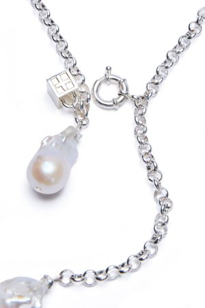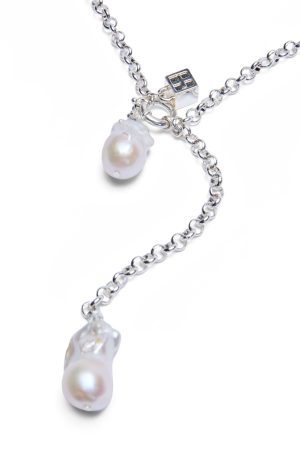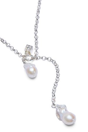 The Twinz Necklace – Pearl features a silver-plated 5mm rollo chain crafted on stainless steel and secured with a sterling silver clasp. Detailed with a silver pyrite stone and two freshwater baroque pearls. it delivers a polished. elevated finish.