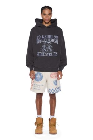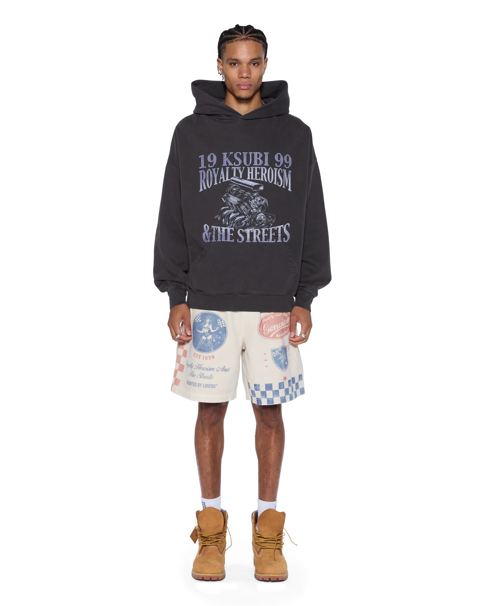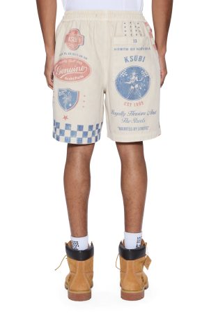The Pit Lane Life Short Printed is a regular fit elastic waist short with a drawstring front. cutaway pockets. and a single back patch pocket. Cut from an overdyed nailhead canvas in a tan colour with a stone wash. it features seasonal artwork printed on the front and back. finished with signature T-box and 4×4 embroidery branding and Ksubi branded hardware.