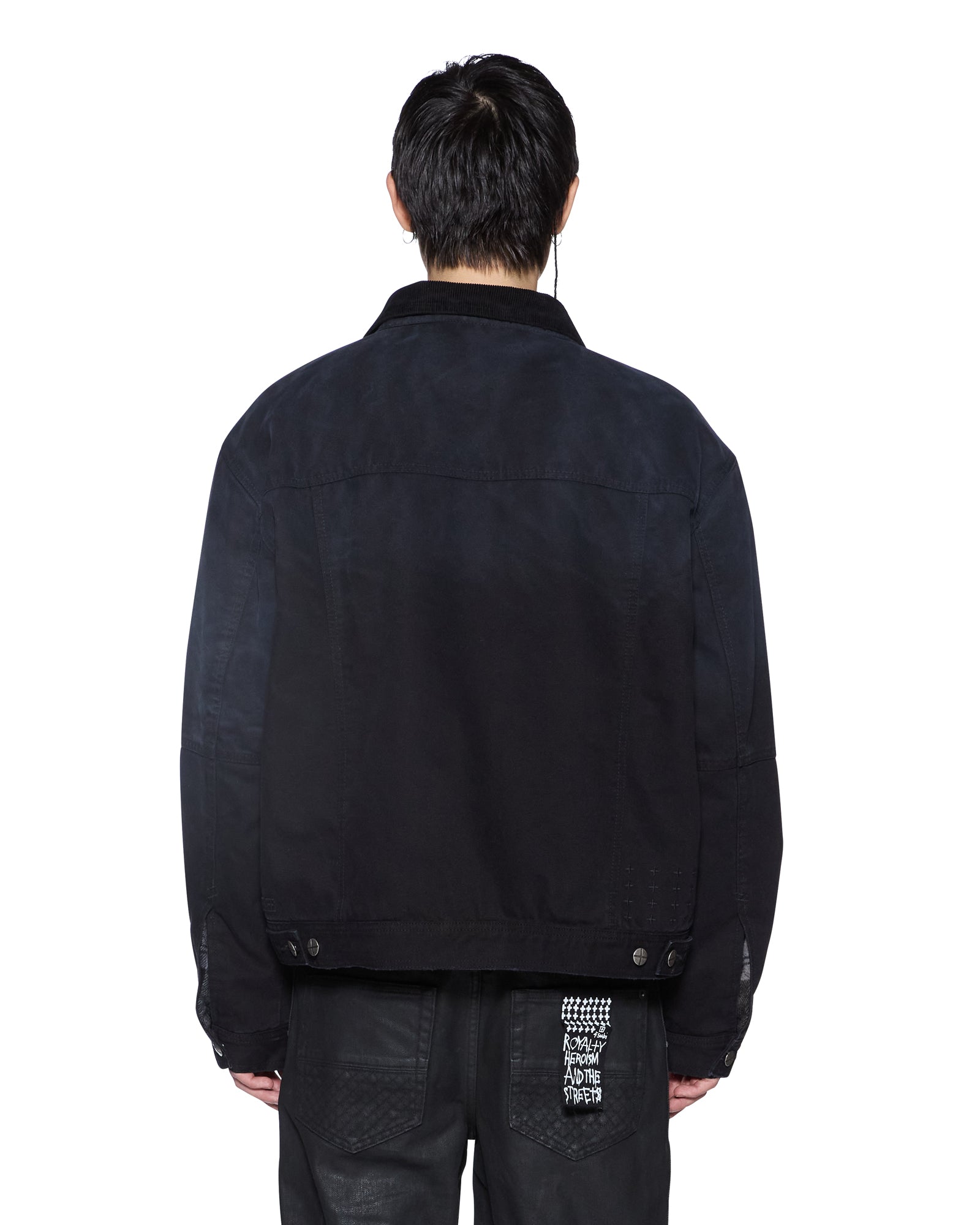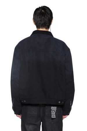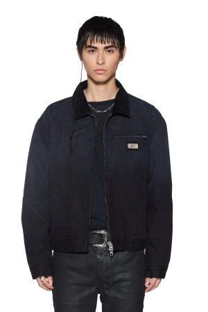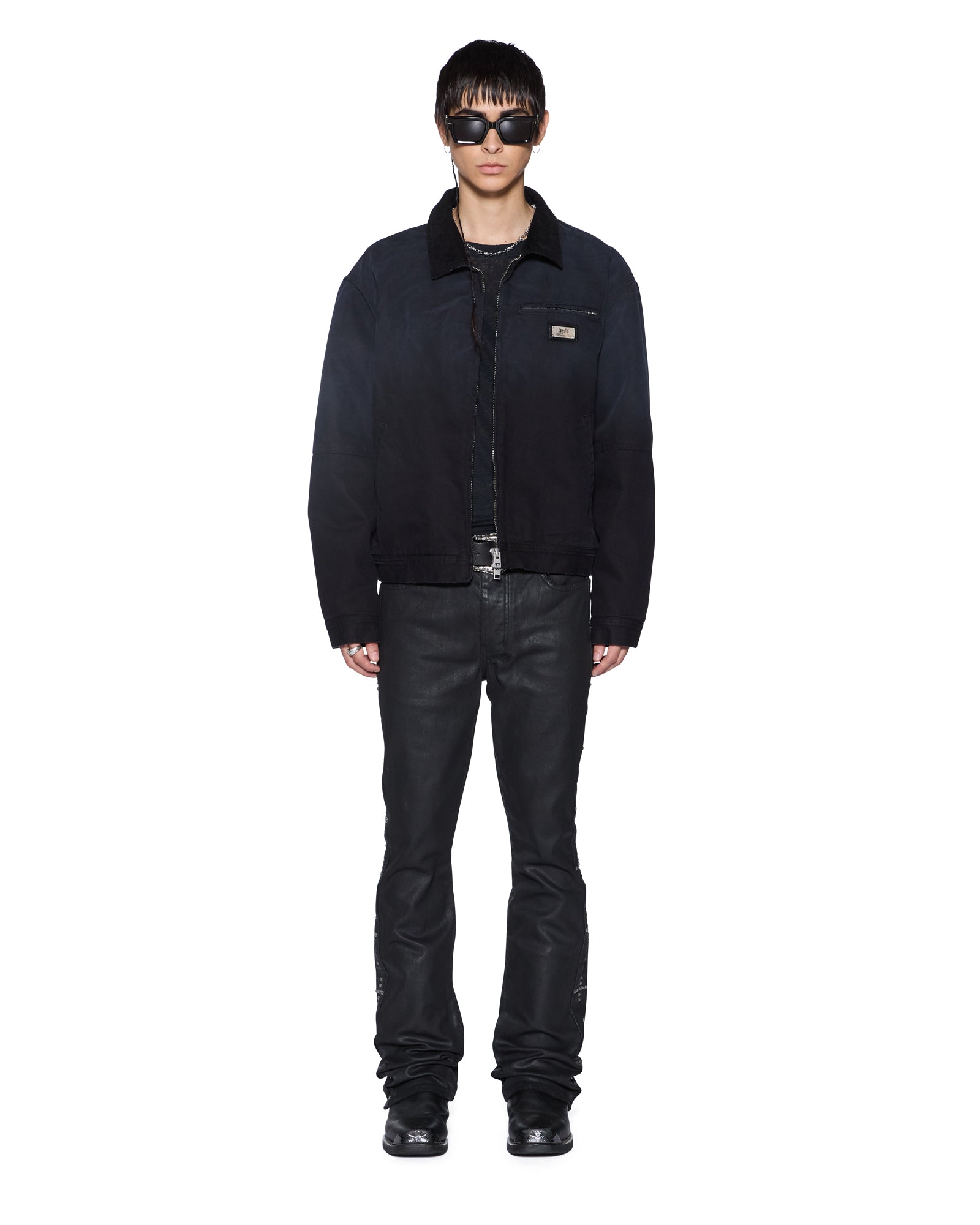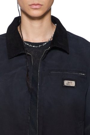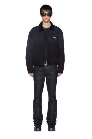 The Plated Greenwich Jacket Black is a boxy fit. regular length fully lined jacket with a zip front closure. wadded lining and a corduroy spread collar. Cut from workwear heavy nailhead canvas. and overdyed in black with ageing treatments. it has a slight spray-on vintage fade at the top of the garment. This premium jacket is constructed with front pouch pockets and a zipped welt chest pocket. and also features a leather backed Ksubi metal plate at the chest and is finished with signature t-box and 4×4 embroidery.