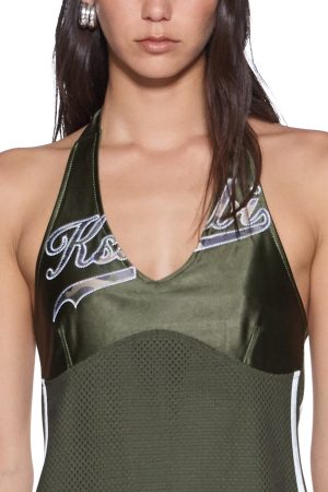The Playoff Halter Dress Hash is a sport-inspired halterneck dress made from satin-finish sports jersey spliced with perforated sports mesh. It features contrast taping along the side seams. a camo-print Playoff graphic across the front chest. a 99 applique on the back. and is finished with Ksubi’s signature T-box embroidery.