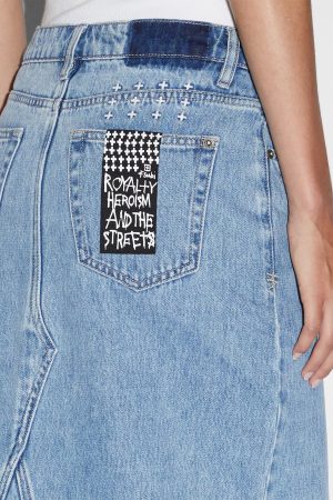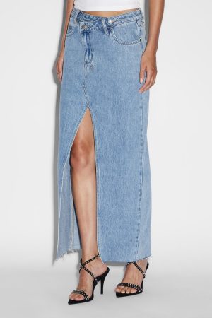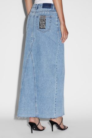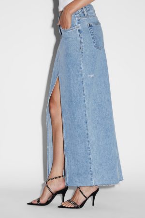 The Relax Maxi Skirt Authentik is a mid-rise. maxi skirt with an asymmetric fly front detail and high split detail at the front. Made from a premium rigid denim in the core blue denim ‘Authentik’ wash. this skirt has classic five-pocket detailing with Ksubi branded hardware and embroidery. Size-up for a more relaxed fit to sit lower on the hips.