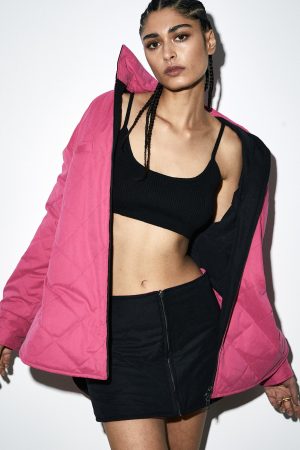The Reversible Skirt is a lightly padded. low rise reversible micro-mini skirt featuring a quilted finish in a fuchsia and black colourway. This style is designed with Ksubi branding and a two way zip at the front. Wear back with the ‘Reversible LS Shacket’ for a mismatched or colour blocked outfit.