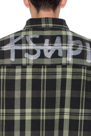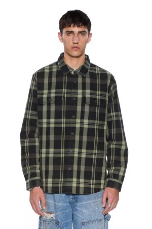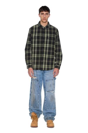The Rosebowl LS Shirt 1999 in Khaki Check is an oversized long-sleeve button-down flannel shirt with a scooped back hem. cut from soft cotton flannel in a black check pattern and treated with a softening garment wash. Designed with chest pockets featuring button closures. a front buttoned placket. and seasonal chain stitched Ksubi embroidery on the front pocket and back. it’s finished with signature T-box and 4×4 branding and Ksubi branded hardware.