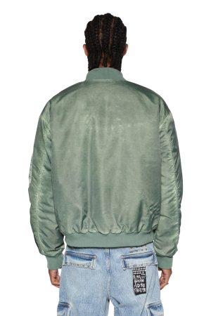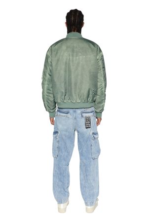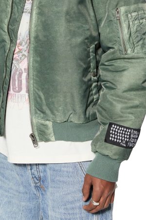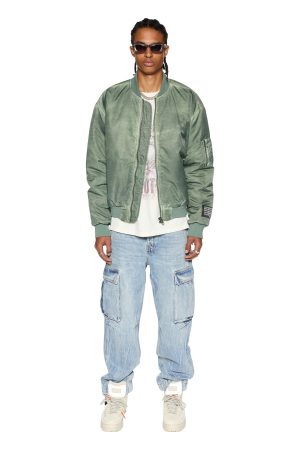 The Royalty Bomber Khaki Overdye is a regular fit padded bomber jacket made from overdyed khaki nylon. with overdyed cotton ribbing at the neck. hem. and sleeves. It features welt closure snap pockets. an internal lining pocket. and a zip-through closure. with tonal embroidery of Ksubi’s 1999 logo at the chest. and is finished with tonal signature T-box and 4×4 embroidery branding.
