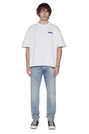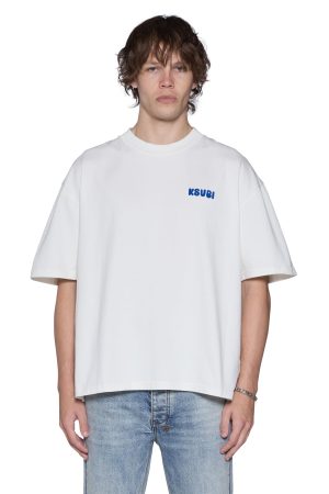 The Royalty Halen SS Tee Vinatge White. is a short-sleeve t-shirt with dropped shoulders and a raw-cut back hem. It features reversed overlocked side seams. Ksubi’s signature rats tail. and branded logos. Crafted from premium cotton jersey in white. it showcases seasonal chainstitched artwork on both the front and back. Finished with signature T-box and 4×4 embroidery branding.
