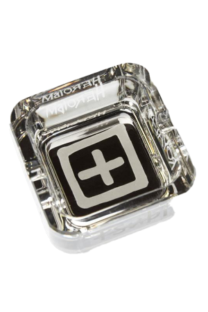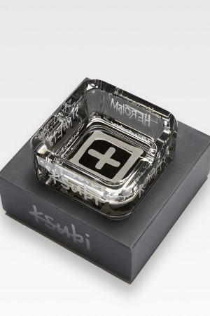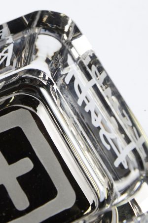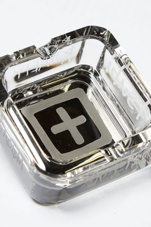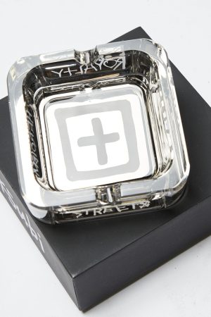 The Royalty Kashtray Grey is a 100% clear glass ashtray featuring a white t-box logo in the centre with a silver base. The Royalty. heroism and the streets text and Ksubi logo is engraved.