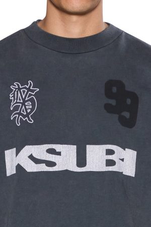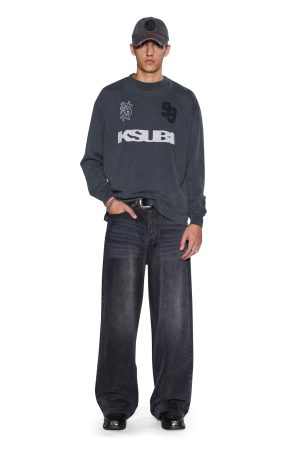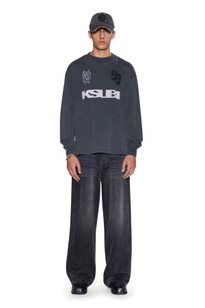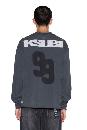 The Rugged Ekcess LS Tee is a boxy. long sleeve t-shirt with dropped shoulders and a raw cut back hem. Crafted from premium cotton jersey garment dyed vintage blue. it showcases reversed overlocked side seams. signature rats tail. seasonal artwork at the front. and a sprayed high/low appearance. Finished with T-box and 4×4 embroidery branding.