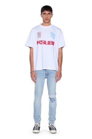 The Rugged Ekcess SS Tee White/Red is a boxy. oversized fit t-shirt with dropped shoulders and a raw cut back hem. Crafted from premium cotton jersey in white. it showcases reversed overlocked side seams. signature rats tail. seasonal artwork at the front. and a sprayed high/low appearance. Finished with T-box and 4×4 embroidery branding.