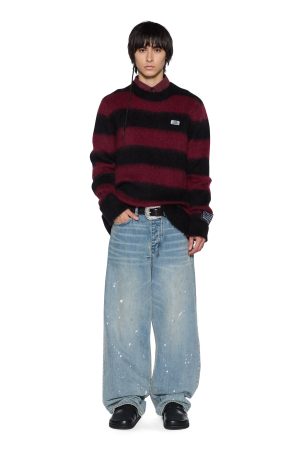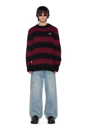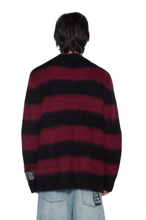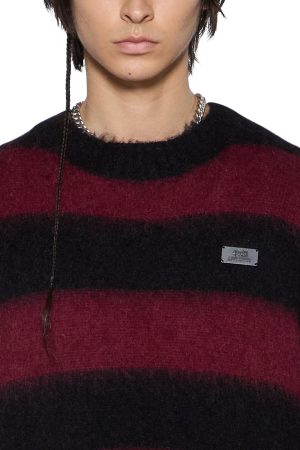 The Rugged Mohair Knit Crewneck Ox is a boxy crew neck knit with a relaxed fit. Made from a high-quality mohair and nylon blend yarn in a black and burgundy stripe. it features an anti-silver metal plate at the chest.