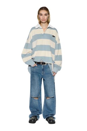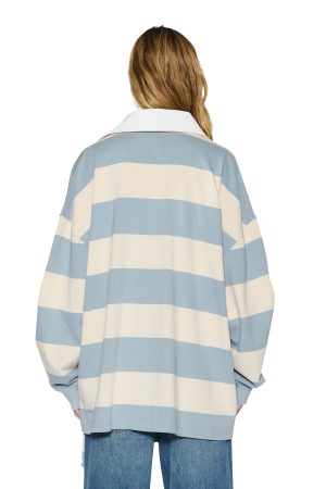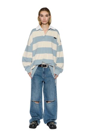 The Rugged Rugby Jersey Blue Steel Bone is an oversized rugby-style jersey with dropped shoulders. bold contrast stripes. a white collar and concealed placket. Made from heavyweight cotton jersey. it features rib-knit cuffs. T-box embroidery. and a silver Ksubi plaque for a relaxed varsity look.