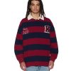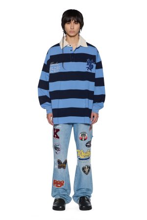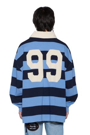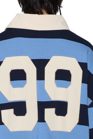 The Rugged Rugby Jersey Faded Ice is an oversized fit jersey with a drop shoulder. designed with classic rugby-inspired detailing including a bold stripe. white point collar. concealed placket and rib knit cuffs. Made from durable cotton jersey. it features a boucle patch and chest embroidery. finished with signature T-box and 4×4 branding.