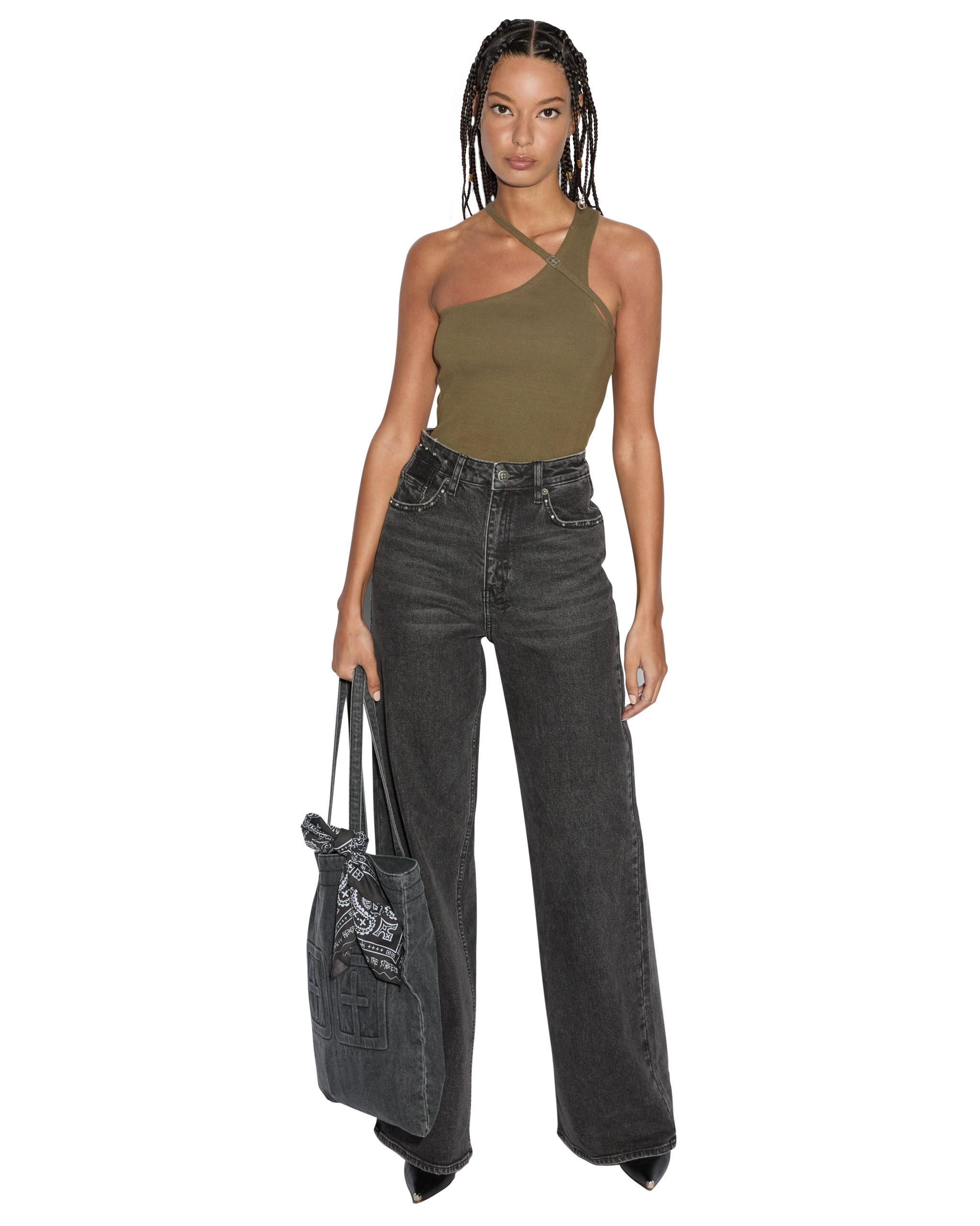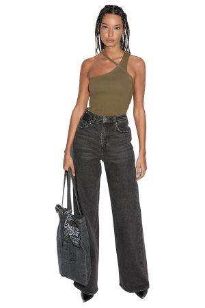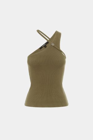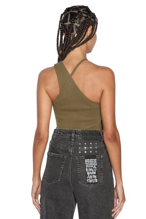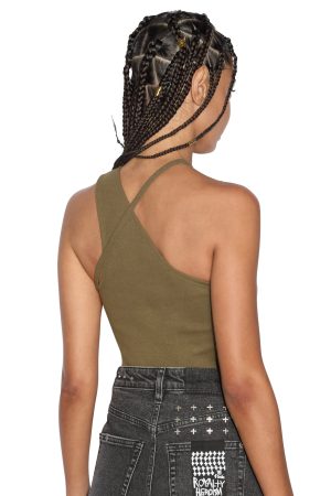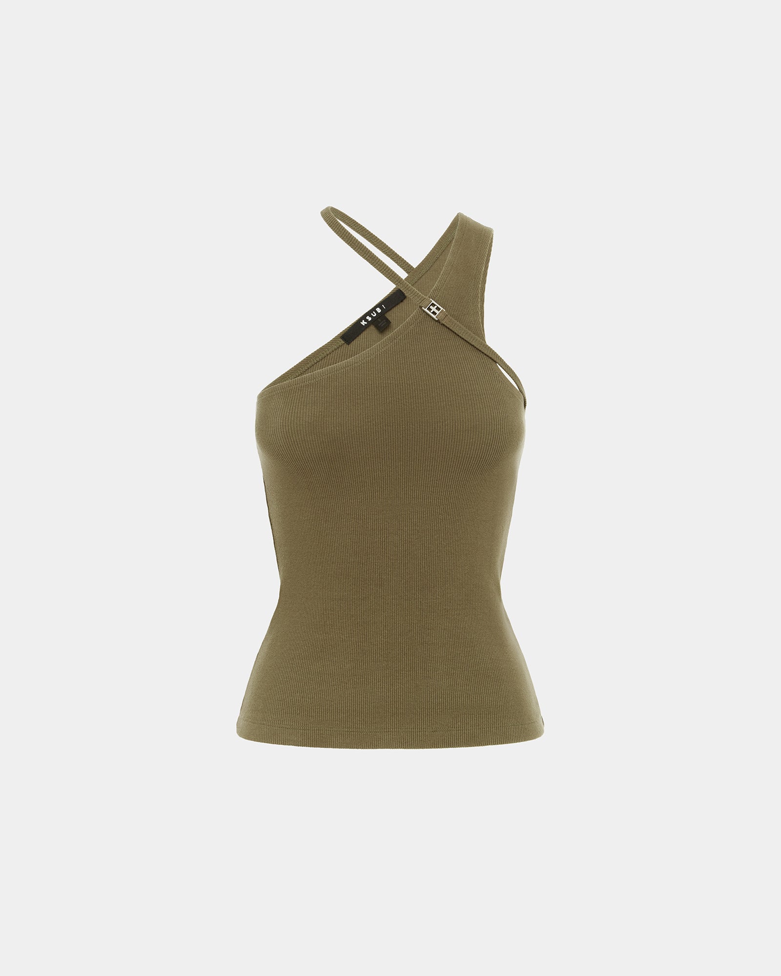 The Score Tank Khaki is an asymmetrical tank top featured in a dark khaki colourway. This top is made from a ribbed cotton elastane blend and detailed with a metal t-box across the strap. Designed with longer length to style back with low rise styles or tucked into high waisted jeans.
