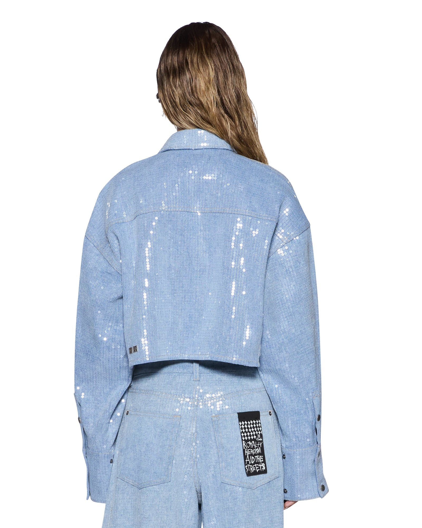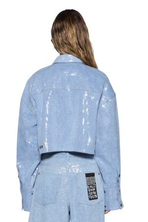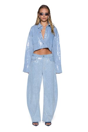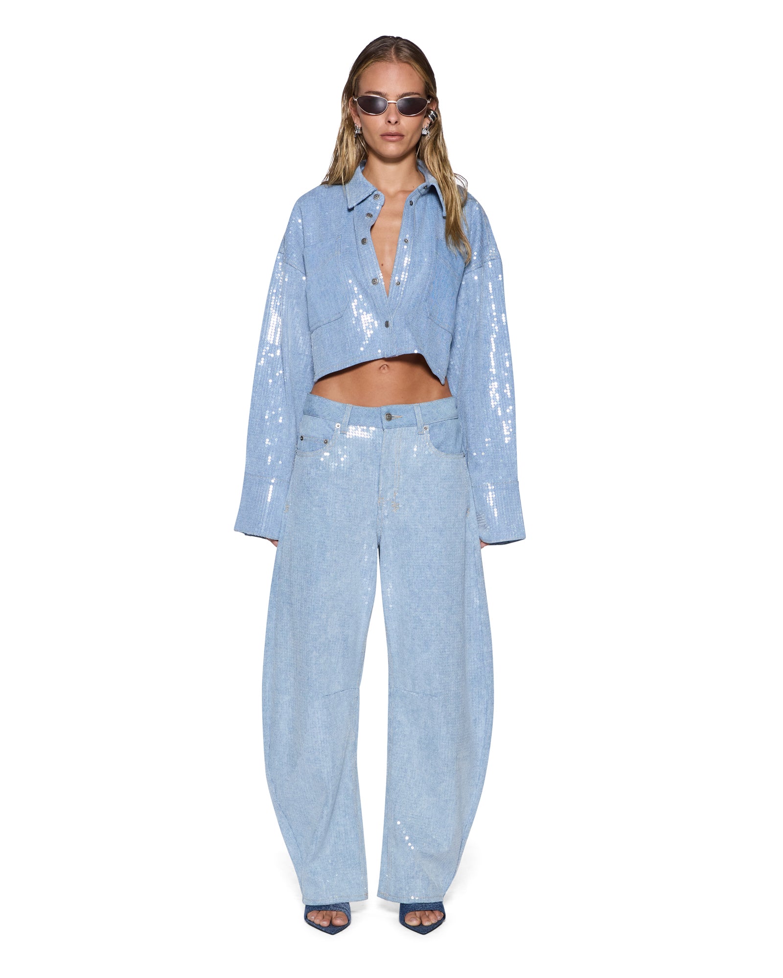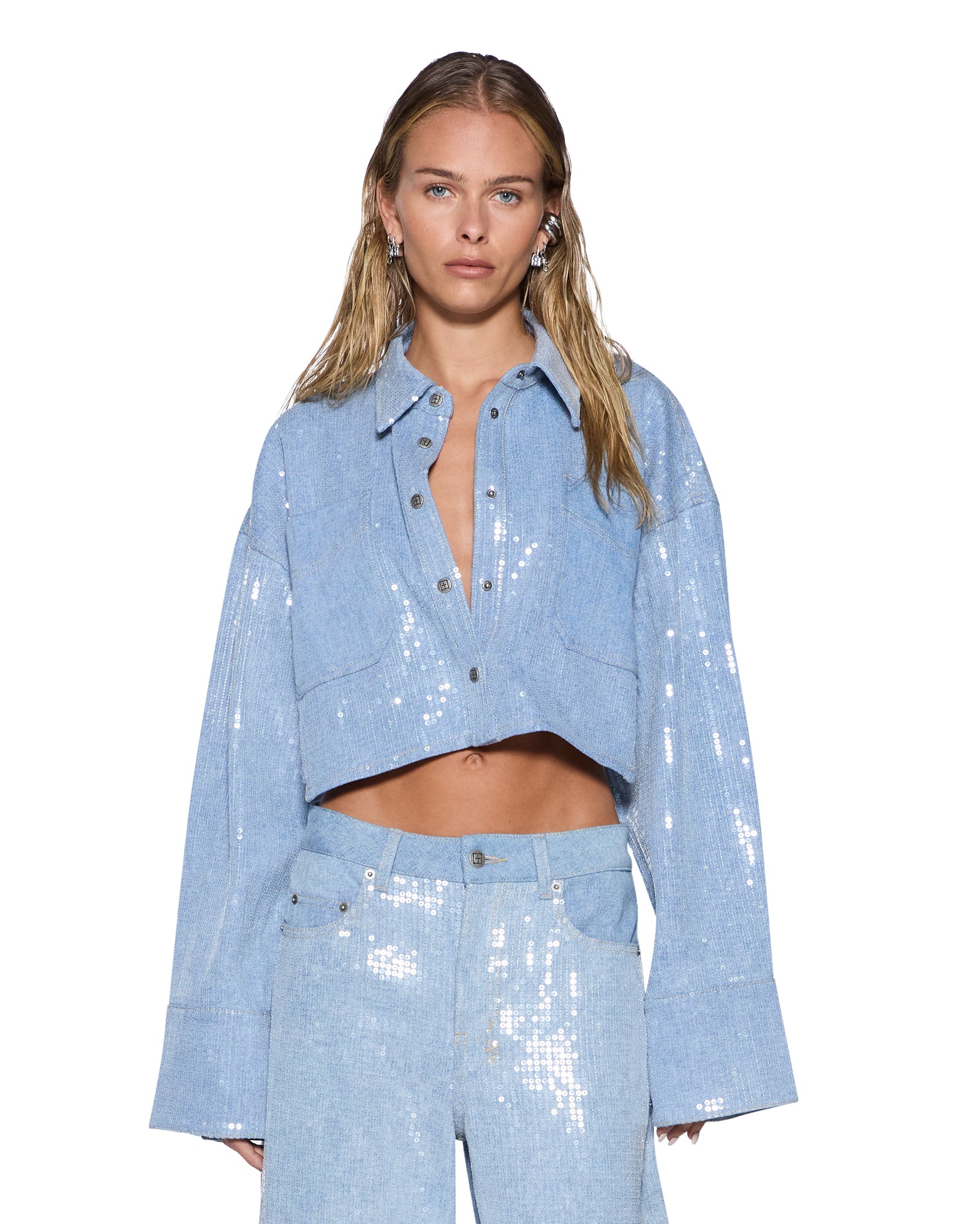 The Sequin Balter Ls Shirt Sequin Spirit Spark is an oversized button up shirt made from lightweight denim in a light blue wash. finished with all over clear sequin embellishment for an elevated party look. Designed with a cropped length. panelled twin patch pockets. a classic centre front collar and exaggerated cuffs. it is finished with Ksubi’s signature t-box embroidery. Style back with the Barrel Jean Spirit Spark for a complete look.