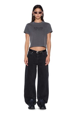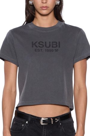 The Shrunken SS Tee Charcoal is cropped crew neck t-shirt in a black colourway with a Ksubi script logo on the front chest. Made from a cotton blend jersey. this tee features classic branding including tonal t-box embroidery.
