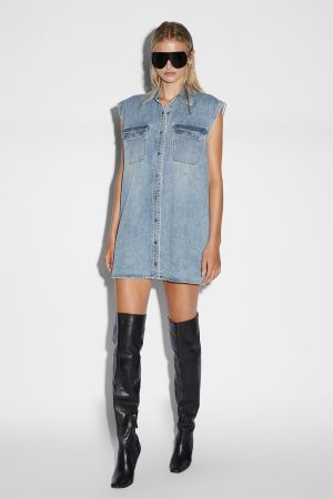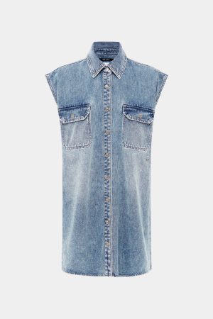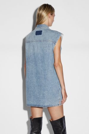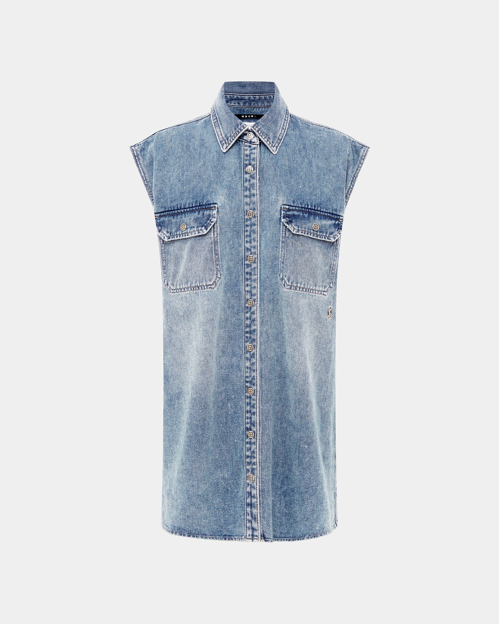 The Sleeveless Dress Overkast is a shirt dress made from a washed blue rigid denim with a soft off-white tint and neutral contrast topstitching. This oversized dress is sleeveless with branded snap buttons at the centre front and pockets. Designed as a relaxed fit with small side seam splits. this dress can be worn on its own as a dress or styled layered over jeans.
