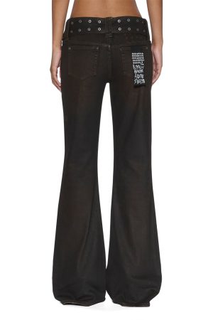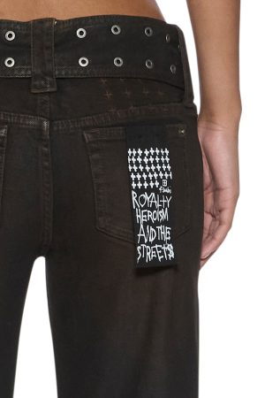 The Soho Lo Belted Greased is a full-length. low-rise bootcut jean made from premium comfort stretch indigo-black waxed denim with a brown. worn-in rusted finish. Featuring a thick waistband with belt loops. removable self-denim belt with eyelet and anti-silver Ksubi-branded buckle. classic five-pocket styling. Ksubi-branded brass hardware. T-box and 3×4 embroidery. and a removable pocket tag on the back pocket. it can be styled back with the Define Trucker Greased for a complete look.