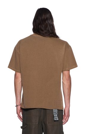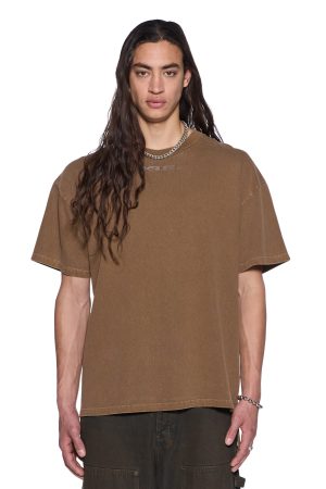 The SOTT Ekcess SS Tee Espresso is an oversized short-sleeve t-shirt with a raw-cut back hem. reverse overlocked side seams. and signature rats tail. Made from premium garment-dyed brown cotton jersey with an aged wash. it features a raised rubber Sign of the Times artwork at the front neck and is finished with signature T-box and 4×4 branding.
