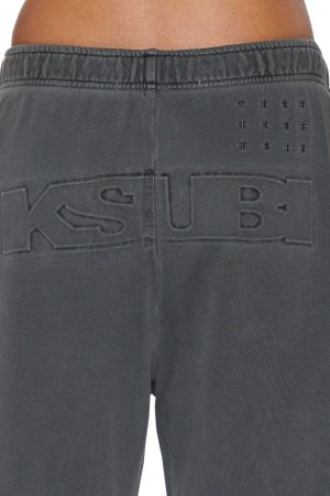 The Sott Origin Trakpant Charcoal is a wide leg track pant with an elasticated waistband and drawcord designed to sit on the mid-waist. Features SOTT branded embossing across the back seat with side welt pockets and a hem drawcord to cinch in. Made from a premium cotton loopback fleece in our signature ‘Charcoal’ colourway with a vintage wash for a worn-in look. It features Ksubi T-box and 3×4 embroidery. Style back with matching SOTT Boxy Hoodie Charcoal.