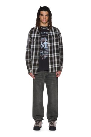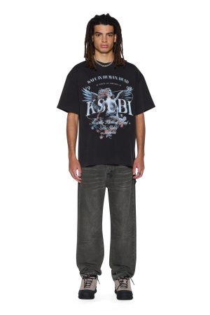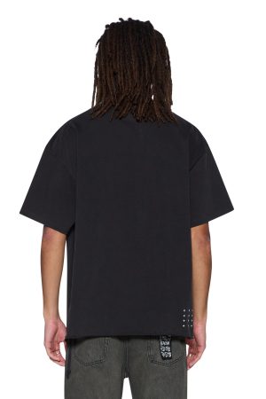 The Spirit Ekcess SS Tee Acid Black is a boxy. oversized short-sleeve t-shirt with dropped shoulders and a raw-cut back hem. It’s detailed with reversed overlocked side seams. Ksubi’s signature rats tail. and branded logos. Crafted from premium cotton jersey in an acid black wash. it features bold seasonal artwork printed on both the front and back. Finished with signature T-box and 4×4 embroidery branding.
