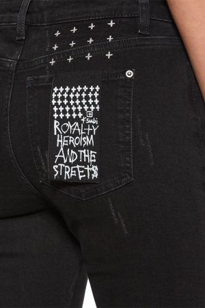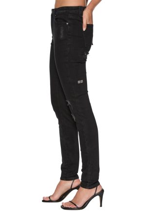 The Spray on Xtra Boneyard Black is a mid rise skinny fit jean with classic pocket detailing and designed with a continuous belt loop on wearer’s left hand side. Made from a premium European comfort-stretch denim. this jean is featured in a lightly stonewashed black colourway. Finished with trashing and scarring throughout and self fabric repair patching. with branded anti-silver hardware and tonal embroidery.