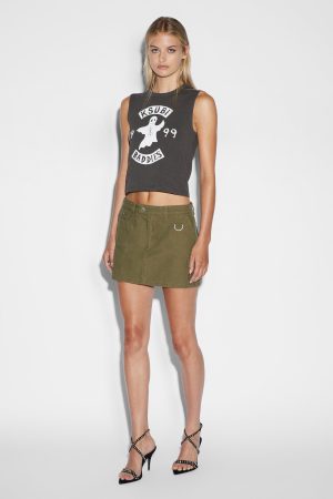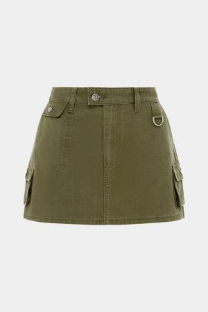 The squad Mini Skirt Khaki is a low-rise. mini skirt with 3D cargo style pocketing and details on the front. Made from a premium rip-stop fabrication in a washed khaki colourway. Designed to sit low on the hips. this skirt features Ksubi branded hardware in anti-silver. tonal embroidered T-box and 3×4 branding on the back.