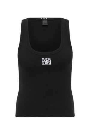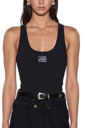 The Stacked Origin Tank Black showcases a square neck and a fitted silhouette in a sleek black colorway. This premium midweight rib tank top features Ksubi logo graphic embroidery. combining style and comfort for a versatile wardrobe essential that pairs seamlessly with any Ksubi denim.