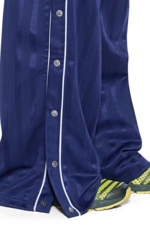The Stacked Origin Trakpant Navy is a mid-rise. wide-leg track pant with an elasticated waistband and drawcord. Made from premium jacquard stripe jersey. it features contrast piping along the side seams. snap-button side panels with welt pocket detailing. and a built-in contrast double-layer boxer short in heavyweight Oxford cotton. Finished with a Ksubi ‘Made in Heaven’ woven patch at centre front and signature 3×4 and T-box embroidery. Style back with the matching Cropped Traktop Navy for a sporty coordinated set.