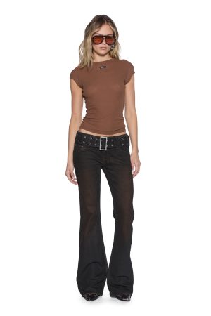 The Staple Short Sleeve Tee Chocolate Sheer is a slim-fit. mock-neck cap sleeve tee made from premium European 100% sheer rib cotton in the seasonal Chocolate colourway. Featuring a woven SOTT label on the front and Ksubi T-box embroidery. it can be used as a layering essential or styled with any Ksubi jeans for an elevated look.