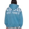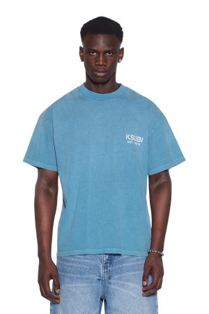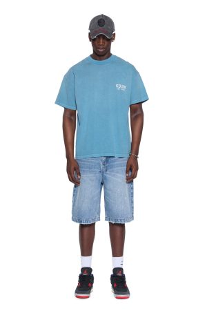 The State Ekcess SS Tee Titan is an oversized short sleeve t-shirt with a raw-cut back hem. reverse overlocked side seam. and signature rats tail. Made from premium cotton jersey in a garment-dyed teal blue with an aged wash. it features the State printed artwork on the front and across the back. and is finished with T-box and 4×4 branding.