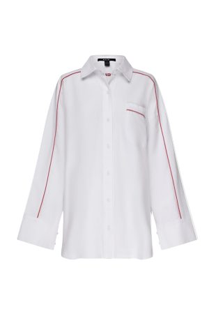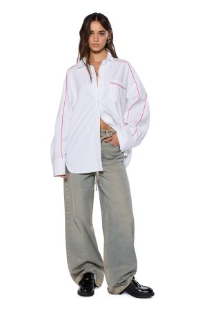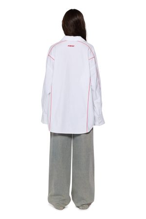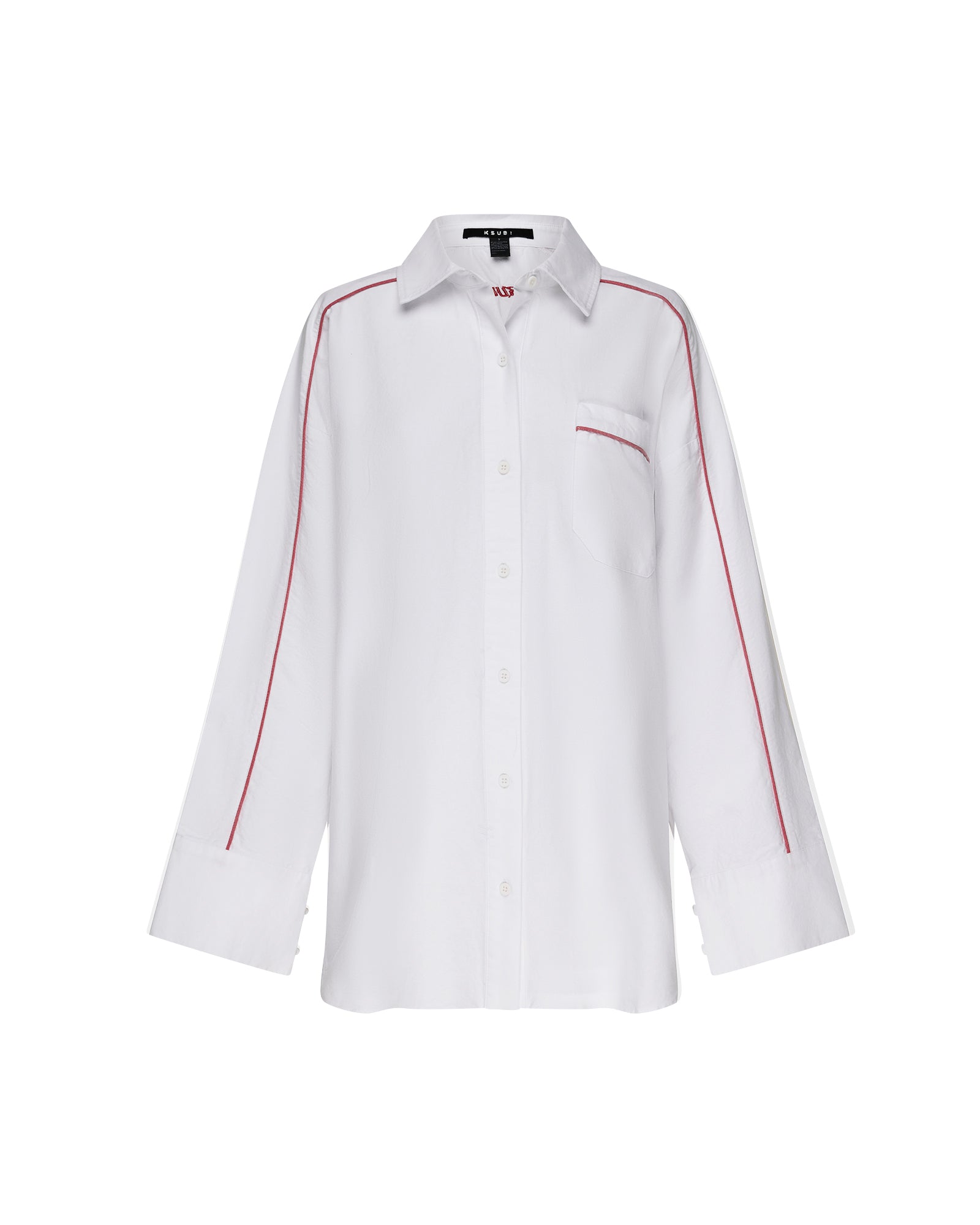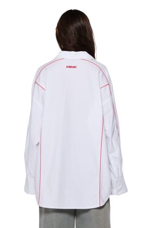 The Stinger Astra LS Shirt White/Red is an oversized button-up shirt made from premium 100% cotton oxford shirting fabric. It features a patch pocket. curved hem. and a classic center front collar with elongated cuffs. designed with contrast piping on sleeves and back panels. Finished with a seasonal Ksubi art hit at back neck and Ksubi T-box and Cross dollar embroidery.