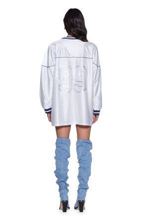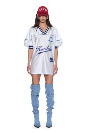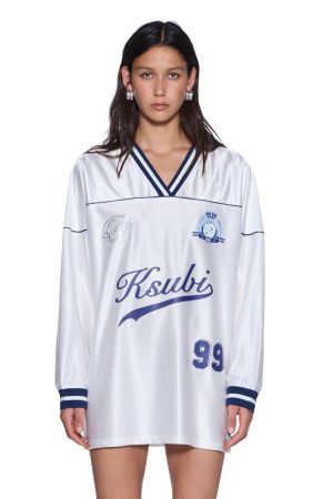 The Teamster LS Dress Vintage White is an oversized V-neck jersey dress with dropped shoulders. long sleeves. and a mini-length silhouette. Made from heavyweight. satin-finish sports jersey in an off-white colourway. it features a deep yoke with contrast piping. sport-stripe rib at the neckline and cuffs. seasonal Ksubi print across the chest. complementary crest graphics. and tonal T-box embroidery. perfect to wear as a statement dress or layered over denim for a sporty. oversized look.