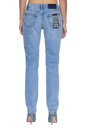 The Moss Jean is a super low-rise. short-crotch. ankle-grazing skinny leg silhouette crafted from premium European 100% rigid denim in Mercer Blue with classic five-pocket styling and vintage-inspired grinding at the hem. waistband and pocket edges. Finished with tobacco topstitching. anti-silver Ksubi hardware. an anti-silver metal press plate at the coin pocket and signature T-box and 3×4 embroidery.