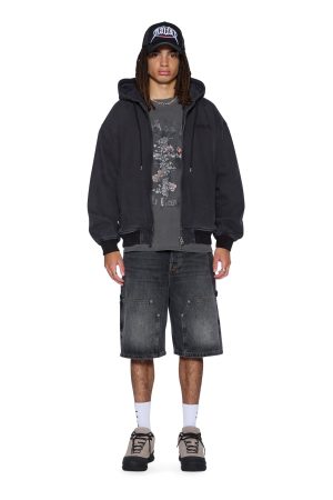 The Thorned Ekcess Ss Tee Charcoal is a boxy oversized fit short sleeve t-shirt with a dropped shoulder and raw-cut back hem. Detailed with reversed overlocked side seams. a signature rats tail. and branded logos. Made from a premium cotton jersey in acid black. it features seasonal artwork printed on the front and back and is finished with T-box and 4×4 embroidery branding.