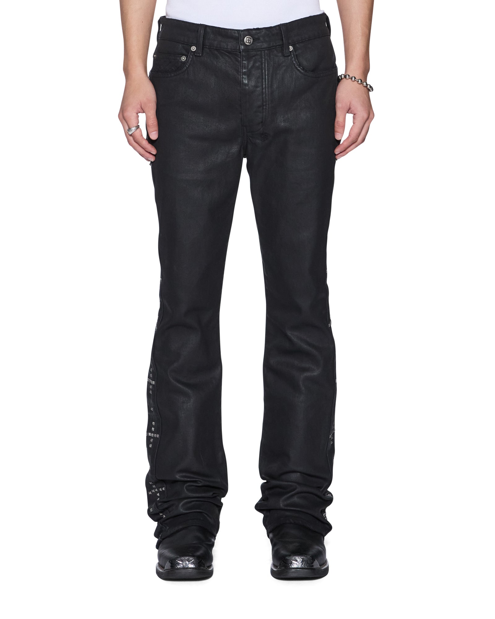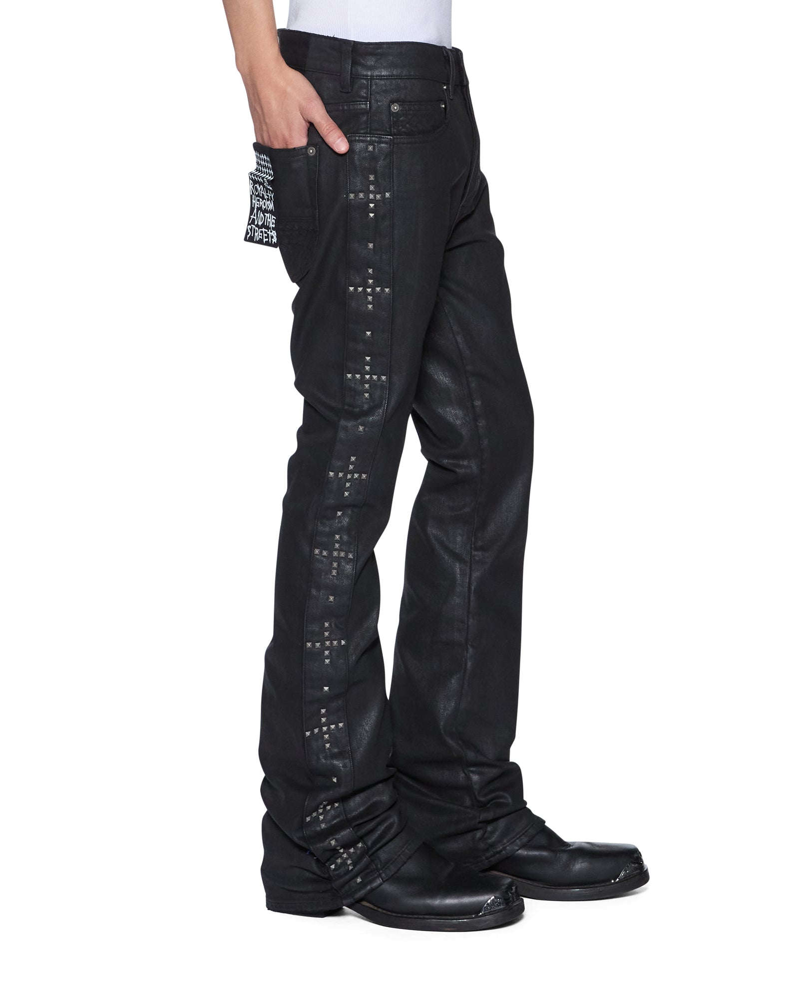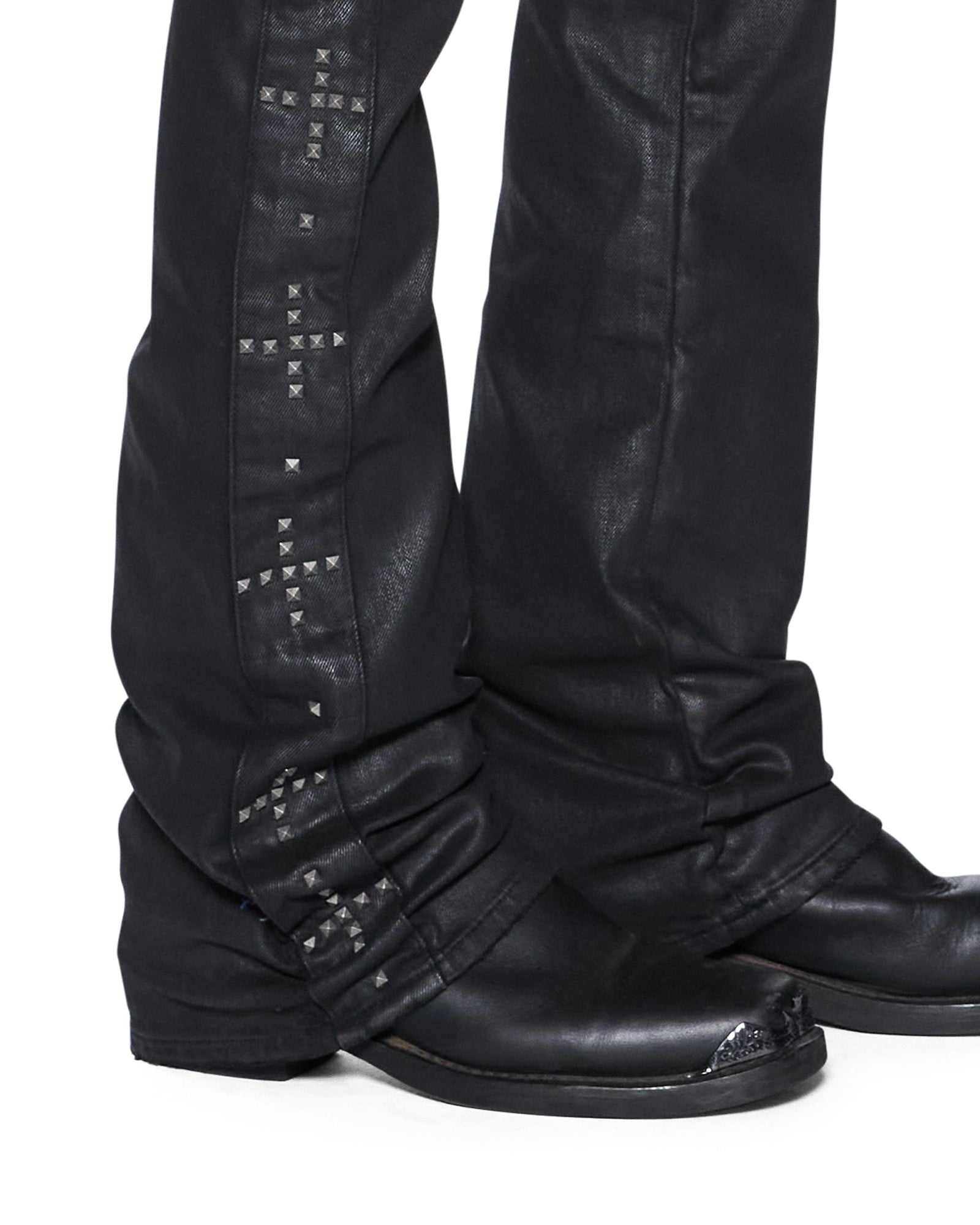 The Bronko Backstage Black Studded is a mid-rise. full-length jean with a boot-cut leg. Made from stretch black denim with a wax wash and flock-coated finish. it features a flocked contrast fabric side seam panel with a plus-stud pattern running down the leg and a black leather backed metal plate at the coin pocket. Finished with hot-fixed diamante t-box and 4×4. ghost patching detailing and Ksubi branded hardware.