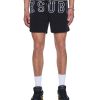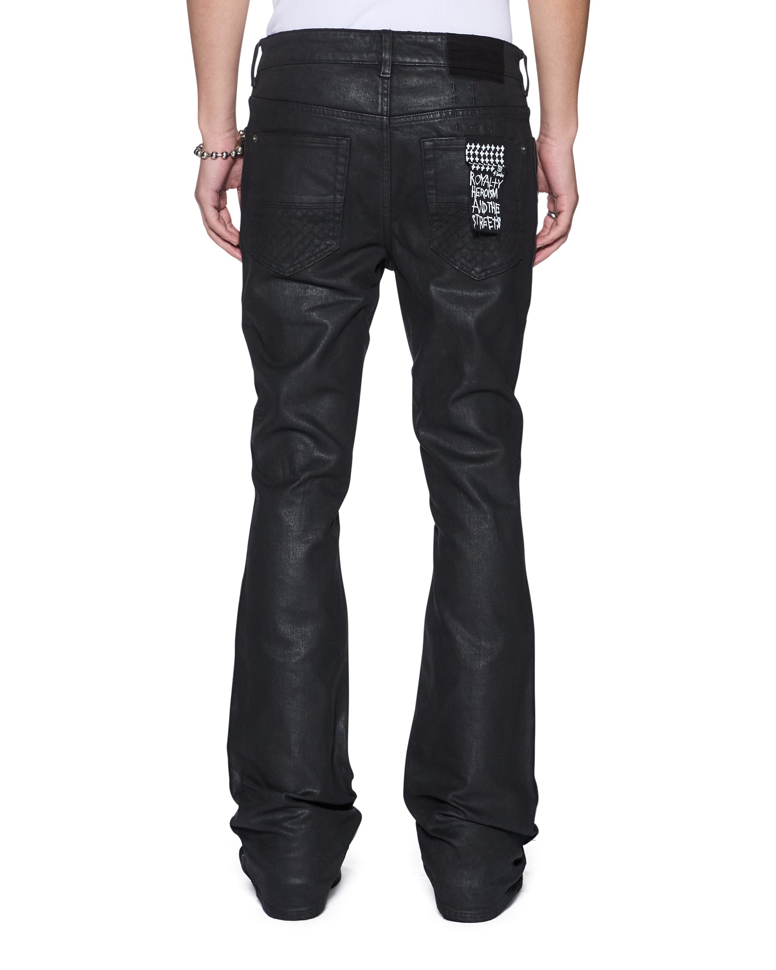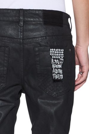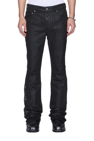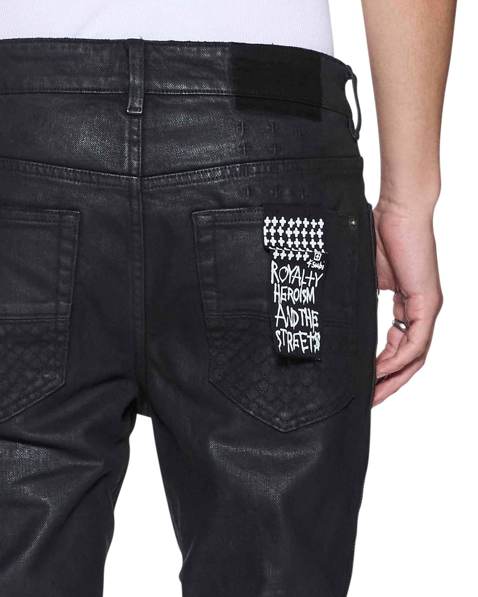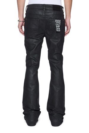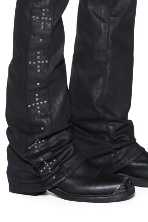 The Bronko Backstage Black Studded is a mid-rise. full-length jean with a boot-cut leg. Made from stretch black denim with a wax wash and flock-coated finish. it features a flocked contrast fabric side seam panel with a plus-stud pattern running down the leg and a black leather backed metal plate at the coin pocket. Finished with hot-fixed diamante t-box and 4×4. ghost patching detailing and Ksubi branded hardware.