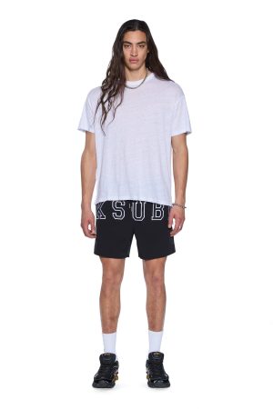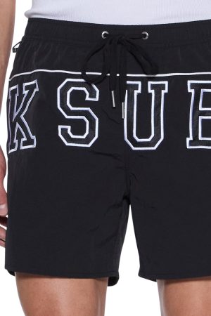 The Touchdown Boardshort Black is a regular-fit boardshort with an elastic waistband and drawstring. Made from premium water-resistant fabric in a white/navy stripe. it features a branded rubber patch on the front and is finished with branded metal trims. T-box charm. and Ksubi T-box printed branding.