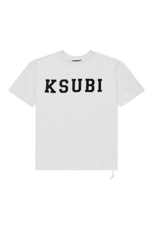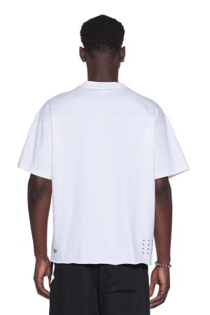 The Touchdown Ekcess Short Sleeve Tee Vintage White is an oversized-fit tee with a raw-cut back hem. reverse overlocked side seams. and signature rats tail. Made from premium cotton jersey in off-white. it features a seasonal logo appliqued in sports mesh on the front and is finished with signature T-box and 4×4 branding.