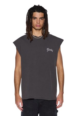 The Truckstop Eckess Cutoff Faded Black is a boxy oversized fitting sleeveless t-shirt with a raw cut back hem. Detailed with a reversed overlocked side seam. signature rats tail. and branded logos. it is made from a premium cotton jersey garment dyed vintage black. Featuring seasonal artwork at the front and back. it is finished with t-box and 4×4 embroidery branding.