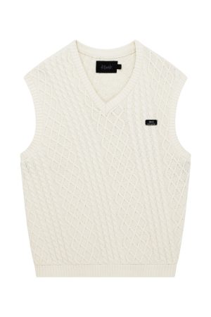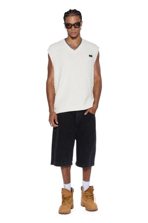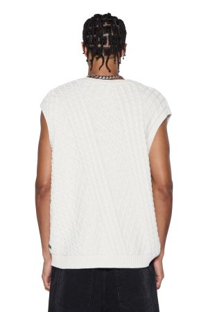 The Turncable Knit Vest Vintage White is a boxy fit. sleeveless vest featuring a v-neckline and ribbed hem. Knitted from 100% cotton yarn in a diagonal cable pattern. it’s finished with a Ksubi metal plate on the chest and T-box riveted branding.