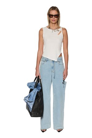 The Twisted Tank White is a full-length tank made from premium lightweight cotton rib in white. It features a unique twisted detail on one shoulder. with a raw cut neckline and side seam split. Branding includes cross dollar and T-box embroidery.