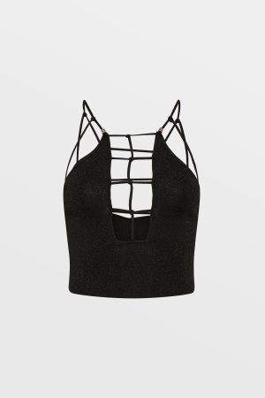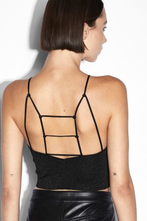 The Untamed Top Black is a fully fashioned knit crop top featuring intricate crossed self tie detailing. t-box cutout om the front strap and our classic Ksubi branding. Made from premium lurex blend yarn in black and copper colourways. this style is detailed with custom Ksubi t-box metal beads on the back straps.