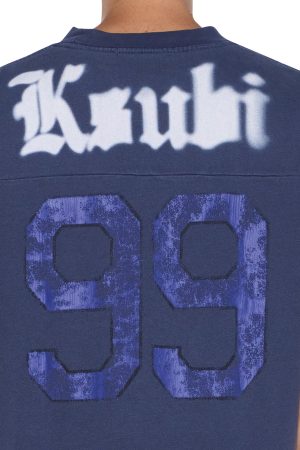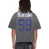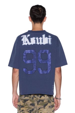 The Utopia Halen SS Tee Navy is a boxy. oversized-fit raglan tee with a waist-hitting hem and drop shoulder. Made from heavyweight cotton garment-dyed jersey in navy. it features reversed overlocked side seams. signature rats tail. and soccer jersey-inspired artwork on the front and back. finished with T-box and 4×4 embroidery branding.