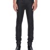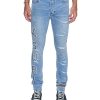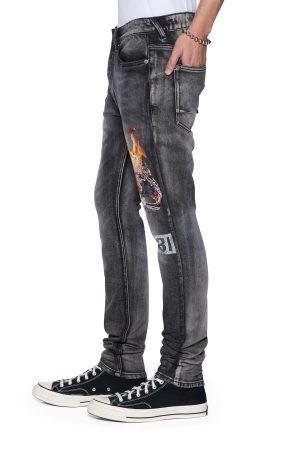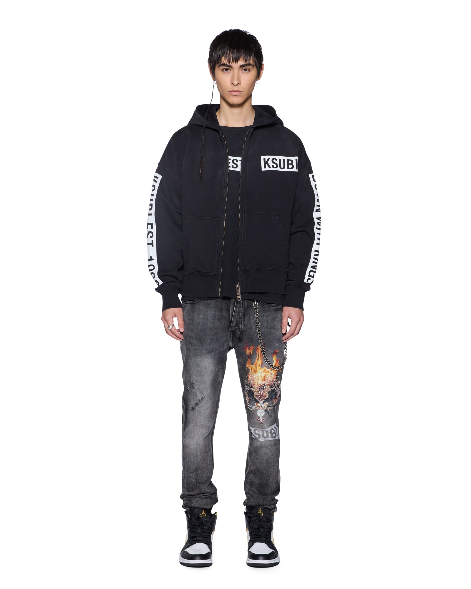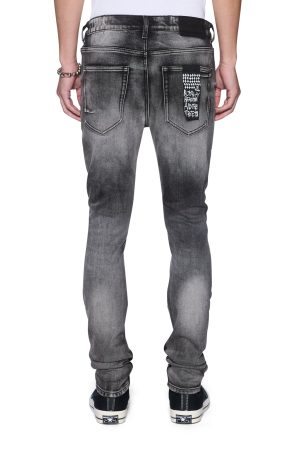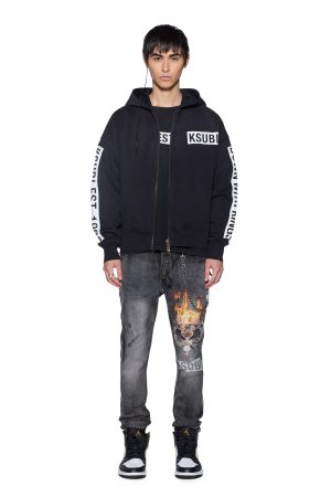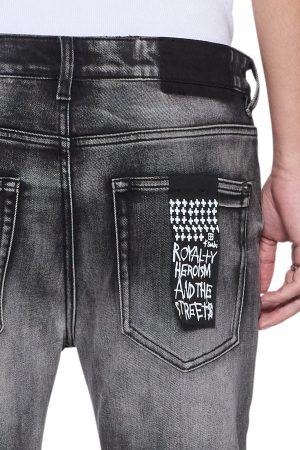 The Van Winkle Asher Kings is a mid-rise five-pocket full-length skinny jean. Made from stretch black denim with a stone wash. it is constructed with unique angled belt loops and front fly seam detail with aging treatments. Features a seasonal artwork placed on the leg. embellished with diamante hot-fixes and a printed Ksubi logo below. Finished with hot-fixed diamante t-box and 4×4. ghost patching detailing and Ksubi branded hardware.