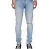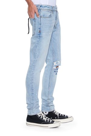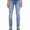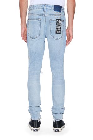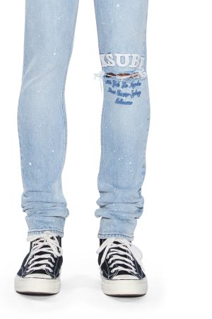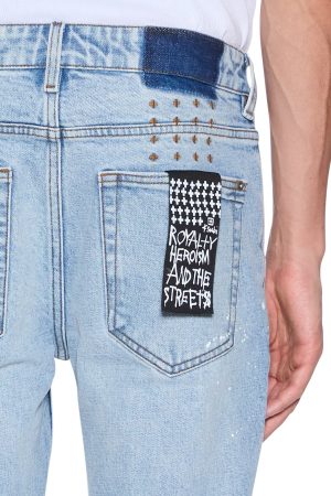 The Van Winkle Duke Blue is a mid-rise. full-length skinny jean with a five-pocket design. Made from indigo comfort stretch denim with a heavy stonewash and authentic ageing treatments. it features paint blotches and seasonal artwork embroidered over the knee. finished with contrast T-box and 4×4 embroidery. ghost patch detailing. and Ksubi hardware.